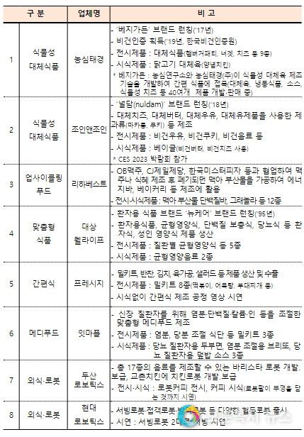 또한 푸드테크 기업으로는 대체식품 등 신(新)식품 제조, 식품 유통, 외식로봇, 새활용식품(업사이클링) 등 푸드테크 분야별 총 10개 기업이 참여하고, 학계에서도 식품뿐만 아니라 의학, 정보통신기술, 로봇 등 다양한 분야 전문가가 참여한다.
