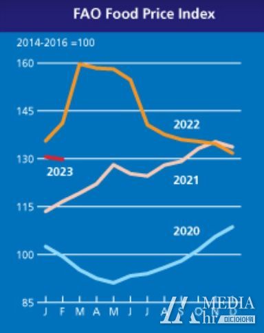 미디어아워 최태문 기자 | 유엔 식량농업기구(FAO)에 따르면, 2023년 2월 세계식량가격지수는 전월(130.6포인트) 대비 0.6% 하락한 129.8포인트를 기록했다. 곡물을 비롯한 대부분 품목군의 가격이 하락했으나 설탕 가격은 상승했다.