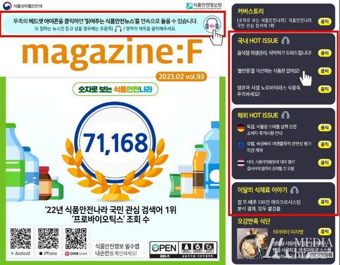 올해는 식품안전나라 월간지인 ‘매거진F’에서 ‘국내‧외 핫이슈’와 계절별 식품 안전정보 등 ‘이달의 식재료 이야기’를 매달 선정해 음성으로 정보를 읽어주는 서비스를 시범적으로 제공한다.