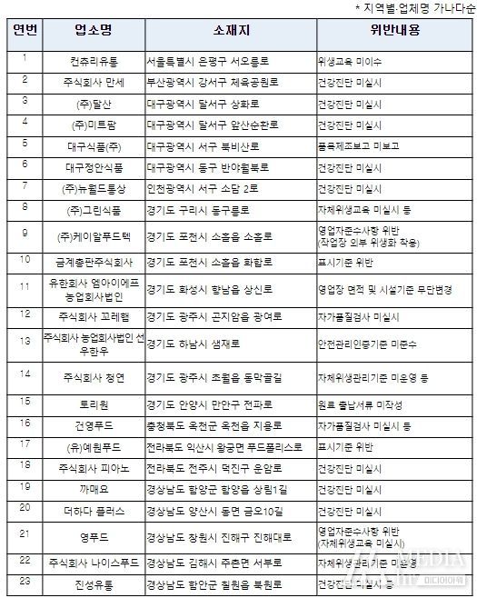 점검 결과 주요 위반내용은 ▲건강진단 미실시(9건) ▲영업자 준수사항 위반(2건) ▲자가품질검사 미실시(2건) ▲자체 위생관리기준 미운영(2건) ▲표시기준 위반(2건) 등이며 이번에 적발된 업체는 관할 지자체 행정처분 등의 조치 후 6개월 이내에 다시 점검해 개선 여부를 확인할 예정이다.