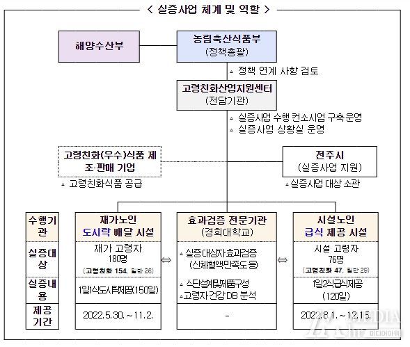 농식품부와 식품진흥원은 고령친화우수식품의 건강개선 효과를 입증하기 위해 재가노인 식사배달서비스(지역사회 통합돌봄)를 받는 65세 이상 고령자를 대상으로 고령친화식단과 일반식단을 5개월간 제공하고, 영양·건강 상태에 미치는 영향을 관찰하는 ‘고령친화식품 실증사업’을 시행했다.