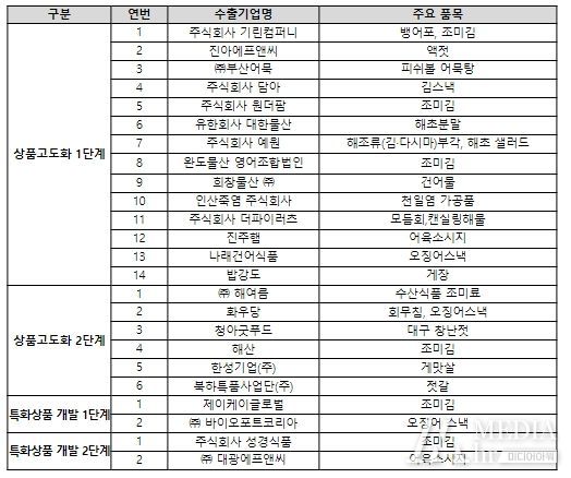 ‘수출유망상품화 사업’은 해외 소비자의 입맞에 맞는 수산 가공식품을 개발하고, 원물 중심의 수산물 수출 구조를 개선하기 위해 2012년부터 추진되고 있다. 참여기업은 해외 소비자의 수요에 맞춘 수산 가공식품을 개발하여 상품화하게 되며, 개발단계, 수출실적 및 성과 등에 따라 상품고도화 1·2단계, 특화상품개발 1·2단계 등 총 4단계로 구분하여 지원받는다.