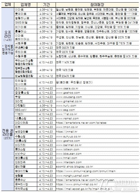 이번 행사에는 이마트, 홈플러스, 롯데마트, 농협 하나로마트, 수협바다마트, 지에스(GS) 리테일 등 14개 오프라인 업체와 우체국쇼핑, 쿠팡, 마켓컬리, 수협쇼핑 등 25개 온라인 쇼핑몰이 참여한다.