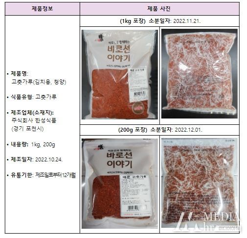 미디어아워 최태문 기자 | 식품의약품안전처는 식품소분업체인 ‘주식회사 한성식품(경기 포천시 소재)’이 소분∙판매한 ‘고추가루(김치용, 청양)(식품유형: 고춧가루)’가 식중독균인 클로스트리디움 퍼프린젠스 기준 부적합으로 확인되어 해당 제품을 판매 중단하고 회수 조치한다.