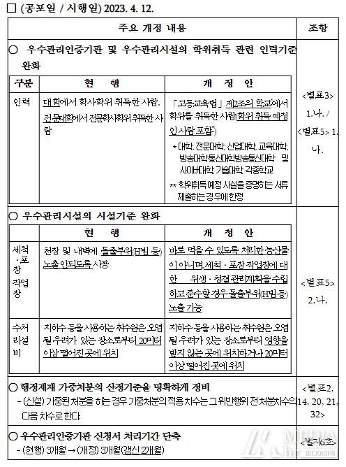 첫째, 우수관리인증기관 및 우수관리시설의 지정기준 중 학위취득과 관련된 인력기준을 완화했다. 학위취득 인정 대학의 종류를 대학 또는 전문대학에서 '고등교육법'에서 정한 학교 전체로 늘리고, 학위취득예정자(학위취득 예정 사실을 증명하는 서류를 제출하는 경우)도 인력기준에 포함시키도록 했다.