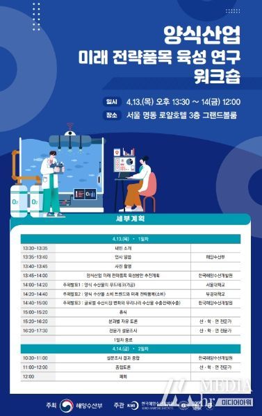 미디어아워 최태문 기자 | 해양수산부는 4월 13일부터 14일(금)까지 로얄호텔서울에서 ‘양식산업 미래 전략품목 선정 워크숍’을 열고, 2030년까지 중점적으로 육성할 전략품목에 대해 논의한다.