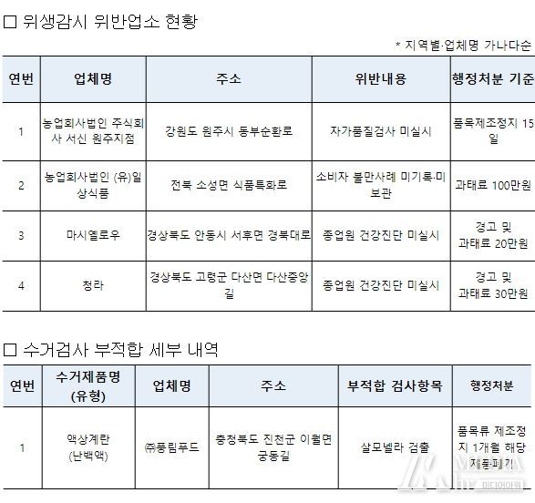 점검결과 주요 위반 내용은 ▲자가품질검사 미실시(1곳) ▲종업원 건강진단 미실시(2곳) ▲소비자 불만 사례 미기록‧미보관(1곳)이며 이번에 적발된 업체는 관할 관청에서 행정처분 등의 조치 후 6개월 이내에 다시 점검하여 개선 여부를 확인할 예정이다.