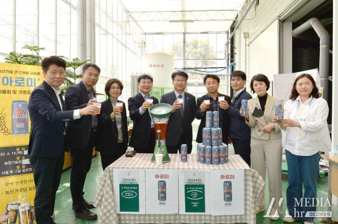 미디어아워 최지나 기자 | 경상남도농업기술원은 국내산 쌀과 아로니아로 만든 수제맥주인 ‘아로미’를 개발하여 13일 경상남도농업기술원 농업기술교육센터(ATEC)에서 농업기술원 직원들을 대상으로 기호도 조사를 추진했다고 밝혔다.