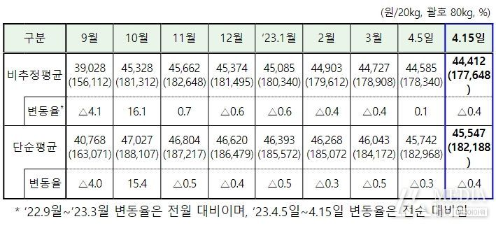 통계청 조사에 따르면, 4.15일자 산지쌀값은 비추정평균 기준 전순 대비 0.4% 하락한 44,412원/20kg 수준이며, 통계 개편 전 추정방식인 단순평균 기준으로는 45,547원/20kg이다.
