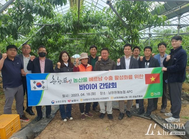 미디어아워 최태문 기자 | 남원시 민선 8기 공약사업 중 하나인 농·축·특산물 수출 확대를 위한 일환으로 새롭게 신시장으로 떠오르고 있는 동남아에 농산물 수출 확대를 위해 베트남 수입바이어와 국내 농산물 수출업체 대표가 4. 18일 남원을 방문하여 남원시 원예산업과장, 남원원예농협 조합장, 남원시조합공동사업법인 대표, 농촌진흥청 수출농업지원과 연구관 등이 참석한 가운데 남원시 농산물 수출품목 육성 및 수출활성화 간담회를 가졌다.