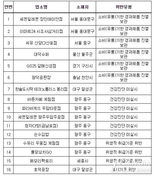 점검결과 주요 위반 내용은 ▲소비(유통)기한 경과제품 보관(20곳) ▲건강진단 미실시(14곳) ▲위생적 취급기준 위반(10곳) ▲보존식 미보관(6곳) ▲표시기준 위반(1곳) 등이며 이번에 적발된 업소는 관할 관청에서 행정처분 등의 조치를 할 예정이다.