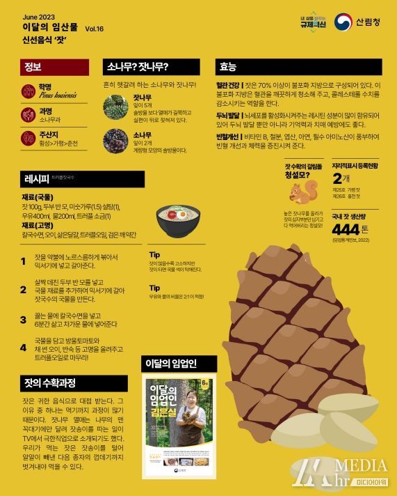 미디어아워 기자 | 산림청은 매월 적극행정 추진을 위해 대표 임산물의 효능과 효과, 조리법 등을 소개하여 임산물의 우수성을 알리고 올바른 임산물 구매를 안내하는 ‘이달의 임산물’ 시리즈를 추진하고 있다. ‘이달의 임산물’ 시리즈는 산림청 블로그에서 만나 볼 수 있다.
