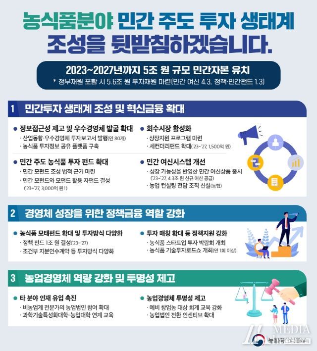 둘째, 민간 출자금을 모집하여 투자 목적의 자(子)펀드에 출자하는 민간 모펀드 조성 기반을 마련한다. 올해 법적 근거를 마련하고, 2027년까지 1,000억 원 규모 민간 모펀드를 조성하여 이를 바탕으로 총 3,000억 원 이상의 민간 펀드를 결성하고 스마트농업, 푸드테크, 그린바이오 등 농식품 신산업 유망경영체에 투자하도록 뒷받침한다. 그리고 농협은행 등 민간 금융기관을 통해 담보력이 부족하지만 유망한 경영체를 위해 기술력, 성장 가능성 등 비재무적 평가를 강화한 여신상품을 출시하여 2027년까지 총 4.3조 원의 신규 여신을 공급한다.