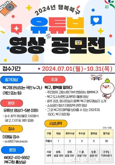 미디어아워 임다연 기자 | 광주시 북구가 주민과 온라인 소통을 강화하고자 ‘행복북구 유튜브 영상 공모전’을 개최한다고 1일 밝혔다.