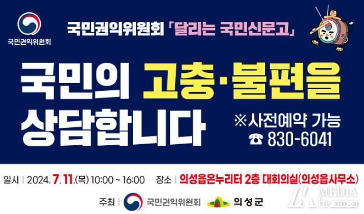 미디어아워 임다연 기자 | 의성군은 국민권익위원회와 합동으로 오는 7월 11일, 목요일 오전 10시부터 오후 4시까지 의성읍온누리터 2층 대회의실(의성읍사무소)에서‘달리는 국민신문고’를 운영한다.