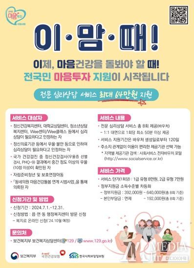 ‘전국민 마음투자 지원 사업’은 1대1 대면 심리상담서비스를 총 8회에 걸쳐 제공하며, 지원대상은 ▲정신건강복지센터, 대학교상담센터, 청소년상담복지센터, wee센터, 정신의료기관 등에서 심리상담이 필요하다고 인정하는 자 ▲국가건강검진에서 중간 이상의 우울증상이 확인된 자 ▲자립준비청년 및 보호연장아동 등으로, 서비스 이용 요금은 최대 64만원(8회 기준)까지 지원하고 소득 수준에 따라 본인부담금이 부과될 수 있다.