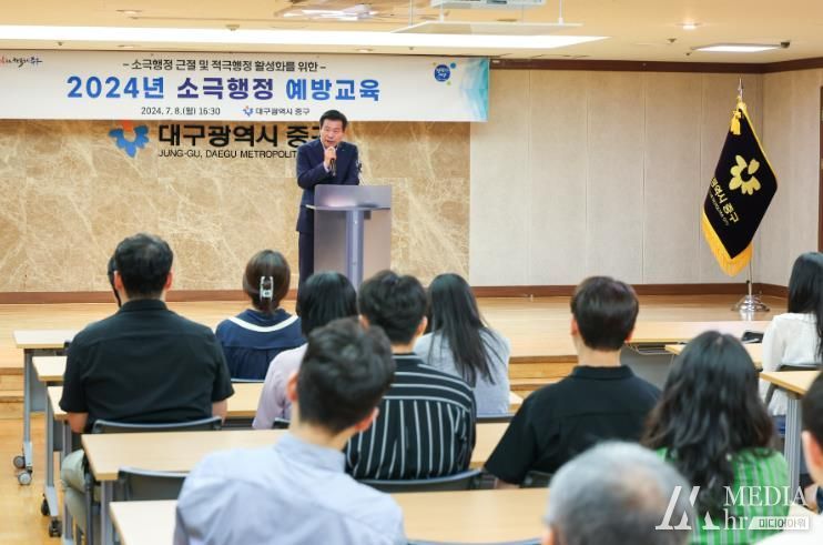 미디어아워 임다연 기자 | 대구 중구는 8일 구청 대상당에서 직원 100여 명을 대상으로 소극행정을 근절하고 적극행정을 활성화하기 위한 소극행정 예방교육을 실시했다.