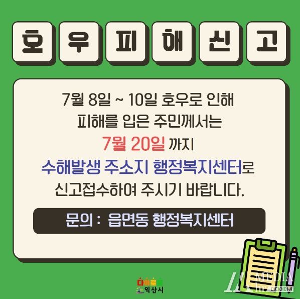 미디어아워 임다연 기자 | 익산시가 오는 20일까지 수해로 인한 자연재난 피해 신고를 접수한다고 12일 밝혔다.