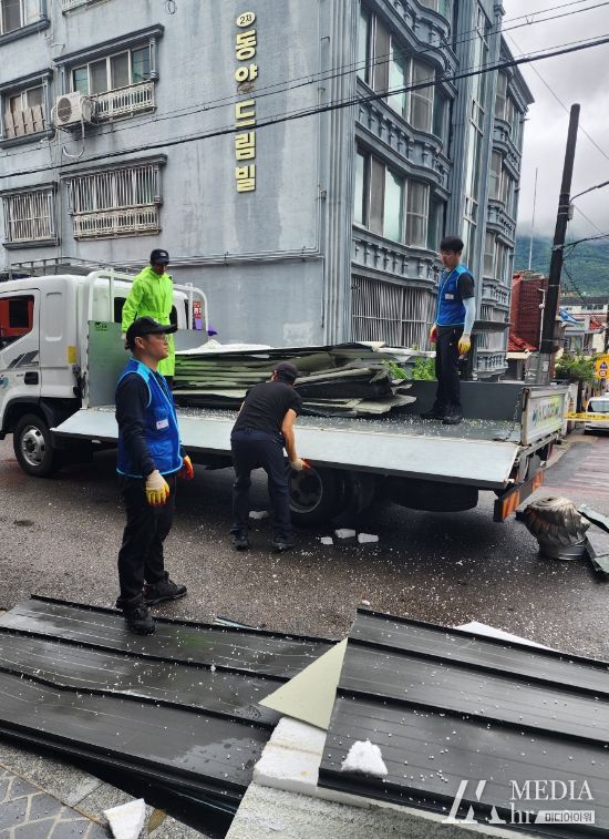 이곳은, 이날 새벽 쏟아진 집중호우(호우경보 발효)로 인해 다세대주택 지붕판넬이 낙하되어 차량1대가 파손되고, 대형낙하물로 인한 주민통행 불편 및 추가피해가 우려되는 현장으로, 녹색환경과는 건축과·소방서와 합동하여 낙하물 절단 및 수거 작업 등 피해 현장에 대한 긴급 환경정비활동을 펼쳤다.
