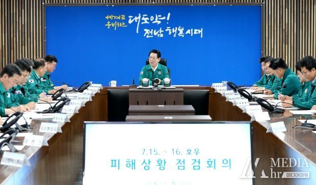 미디어아워 임다연 기자 | 김영록 전라남도지사는 16일 오전 재난종합상황실에서 집중호우에 따른 피해상황을 점검하고, 특히 계속 되는 비에 산사태 취약지역 관리 및 사전선제적 대피 등으로 인명피해를 최소화할 것을 강조했다.