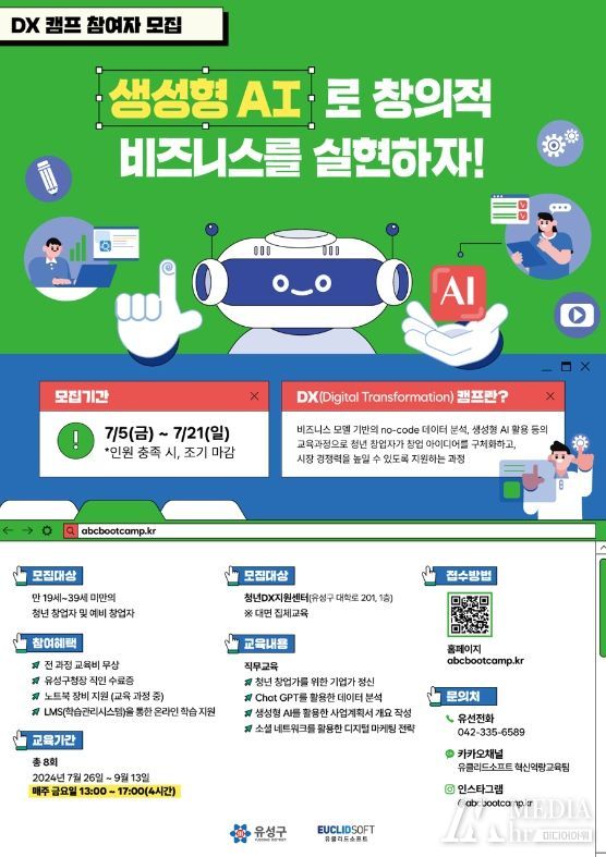 미디어아워 임다연 기자 | 대전 유성구는 오는 26일부터 8주간 청년(예비)창업자 맞춤형 디지털 역량강화 교육을 제공하는‘2024 창업청년 DX캠프’를 운영한다.