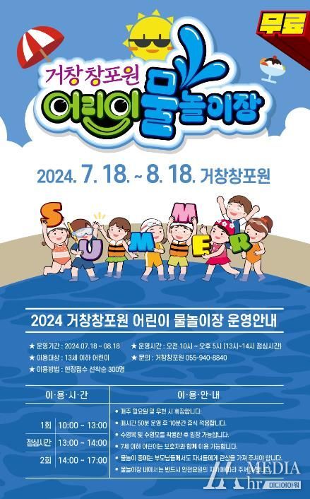 미디어아워 임다연 기자 | 거창군은 오는 18일부터 다음 달 18일까지 32일간 무더위를 날려줄 가족들의 휴식공간을 제공하기 위해 거창창포원 내 어린이 물놀이장을 운영한다.