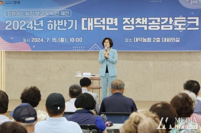 미디어아워 임다연 기자 | 안성시 대덕면은 지난 15일 대덕농협 대회의실에서 대덕면 주민들 100여 명과 김보라 안성시장이 주민과 소통하는 ‘2024년 하반기 정책공감토크’ 행사를 성황리에 마쳤다고 밝혔다.