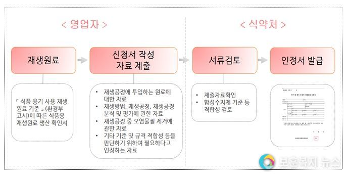 ① 물리적 재생원료 인정절차는 영업자가 기구 등의 제조에 투입하는 물리적 재생원료에 대한 자료, 재생방법, 재생공정 등 구비서류를 식약처에 제출하면 식약처는 제출 자료를 검토해 안전성을 심사하고 인정서를 발급한다.