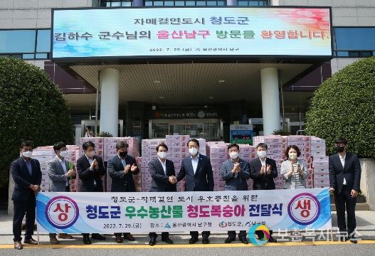 보훈복지뉴스 유서진 기자 | 청도군은 29일 울산광역시 남구청에서 복숭아 전달식을 가지고, 자매결연도시 청도복숭아 판촉행사를 개최하였다.