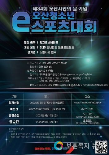 보훈복지뉴스 유서진 기자 | 오산시가 오는 17일 “오산시민의 날 e-스포츠 청소년 대회”를 오산문화스포츠센터 소체육관에서 개최한다.