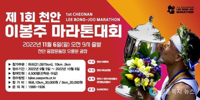보훈복지뉴스 유서진 기자 | 천안시체육회는 11월 6일 종합운동장 오륜문광장에서 출발하는 ‘제1회 천안 이봉주 마라톤대회’ 4,500명 참가 신청을 마감하고 전국 마라톤 동호인과 일반참가자를 맞이할 준비에 총력을 기울이고 있다고 밝혔다.