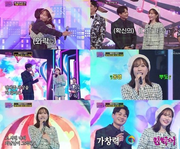 끝으로 행운권 라운드에서 별사랑과 친오빠가 의기투합한 ‘윤가네’ 팀은 이문세의 ‘알 수 없는 인생’으로 잊지 못할 듀엣 무대를 선사했다. 두 사람은 달콤한 화음과 다정한 아이 콘택트로 눈과 귀를 사로잡았고, ‘찐 남매’다운 아름다운 하모니로 안방극장에 귀호강을 선물했다.
