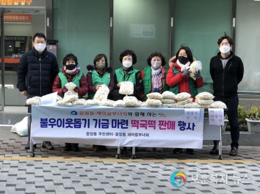 보훈복지뉴스 유서진 기자 | 부산 중구 중앙동 주민센터는 지난 17일 새마을부녀회 회원들과 함께 중앙동 주민센터 앞에서 불우이웃돕기 성금 모금 마련을 위한 떡국떡 판매행사를 가졌다.