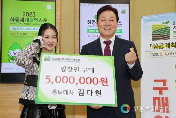 보훈복지뉴스 유서진 기자 | (재)하동세계차엑스포조직위원회는 조직위 이사장인 박완수 도지사와 홍보대사인 김다현 양이 엑스포 사전 붐 조성을 위해 500만원 상당의 입장권 구매 약정을 체결했다고 밝혔다.