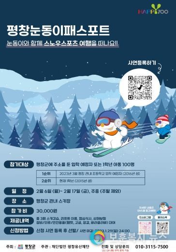 보훈복지뉴스 유서진 기자 | 평창군이 주최하고 재단법인 평창유산재단이 주관하는 ‘2023 평창눈동이패스포트’ 프로그램은 관내 초등학교 입학 예정자와 1학년 학생 100명을 대상으로 오는 2월 6일부 17일까지 평창군 관내 스키리조트에서 진행된다.