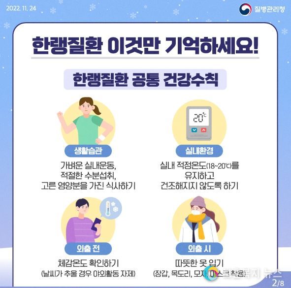 질병관리청 지영미 청장은 “한랭질환은 사전에 적절한 조치로 예방할 수 있으므로, 한파 대비 건강수칙을 준수해 줄 것”을 당부하며, 특히 “설 연휴 마지막 날부터 전국 곳곳에 강추위가 예상되므로 한파에 취약한 고령층, 기저질환자, 노숙인, 어린이, 실외작업자 등에 대한 각별한 주의와 관심이 필요하다”고 강조했다.