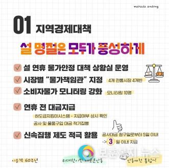 주요 성수품의 수급안정과 건전한 유통질서 확립을 위해 물가대책 상황실을 운영하고, 소매점, 골목슈퍼, 대규모 점포, 전통시장 등을 대상으로 설 명절 판매가격 및 단위가격 표시 등 이행 실태점검에 나선다.