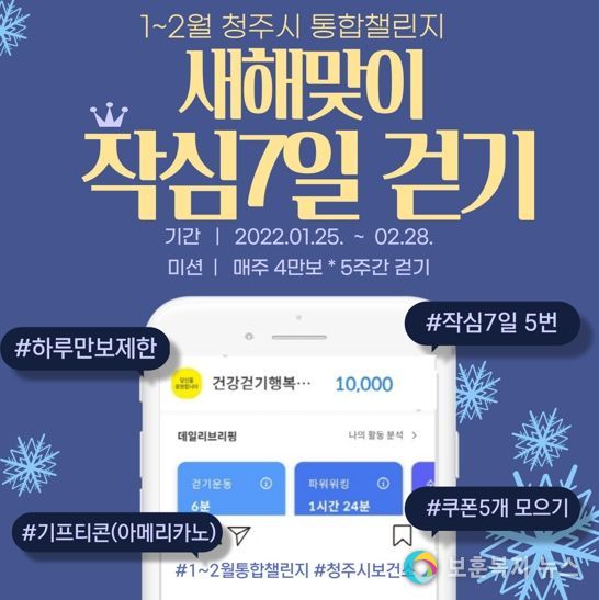 보훈복지뉴스 유서진 기자 | 청주시 보건소는 오는 25일부터 2월28일까지 5주간‘새해맞이 작심 7일 걷기 챌린지’를 운영한다.