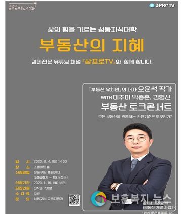 보훈복지뉴스 유서진 기자 | 서울 성동구가 오는 2월 4일 성동지식대학의 새해 첫 강연으로 ‘부동산의 지혜 토크콘서트'를 소월아트홀에서 개최한다.