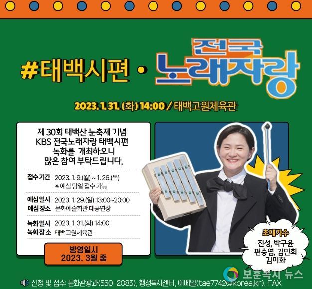 보훈복지뉴스 유서진 기자 | 태백시는 제30회 태백산 눈축제를 기념해 오는 31일 태백고원체육관에서 녹화가 진행되는 ‘KBS 전국노래자랑 태백시편’에 대한 예심 접수기간을 연장한다고 밝혔다.
