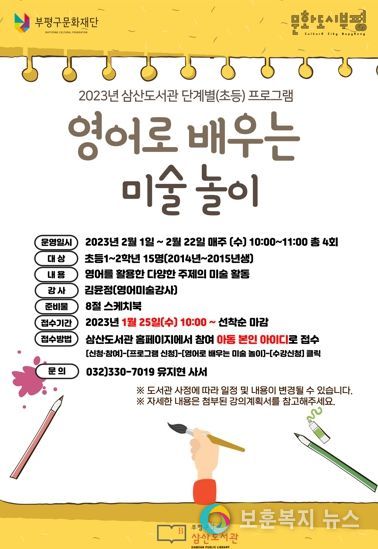 보훈복지뉴스 유서진 기자 | 부평구 삼산도서관이 25일부터 ‘영어로 배우는 미술 놀이’ 참가자를 모집한다.