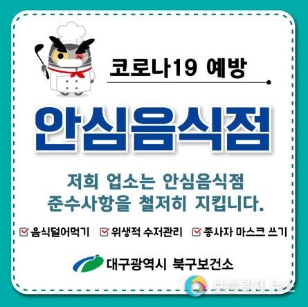 보훈복지뉴스 유서진 기자 | 대구 북구보건소는 지난해에 이어 올해도 시민들이 안심하고 이용할 수 있는 외식환경 조성과 위생적인 식사문화 보급을 확산하기 위해 생활방역 수칙을 준수하는 ‘안심음식점’을 지속적으로 모집한다.