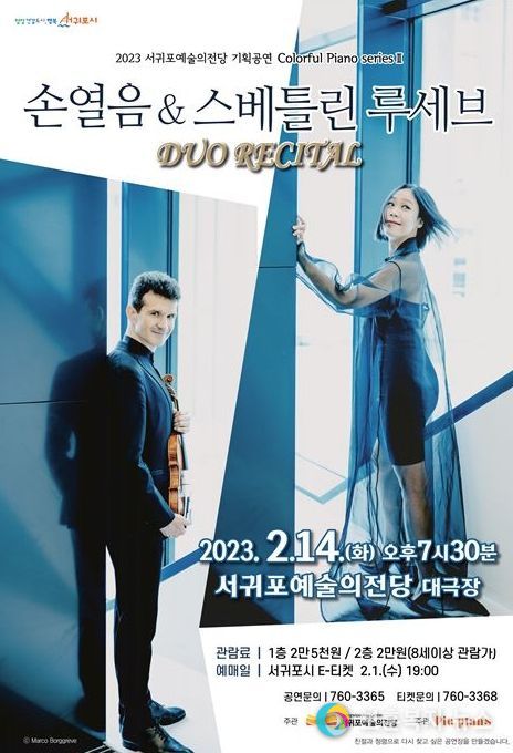 보훈복지뉴스 유서진 기자 | 서귀포시는 2023 Colorful Piano 두 번째 시리즈 피아니스트 손열음과 바이올린 스베틀린 루세브 듀오 리사이틀을 2월 14일 오후 7시 30분에 서귀포예술의전당 대극장에서 개최한다.