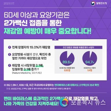 코로나19는 어르신에게 여전히 위험하고 재감염시 사망위험이 더 높은 상황으로 일평균 위중증 환자 중 60세 이상이 88.8%, 주간 사망자 중 60세 이상이 95.4%, 60세 이상에서 재감염시 사망위험이 1회 감염 시 보다 1.72배 높은 것으로 질병관리청에서 발표했다.