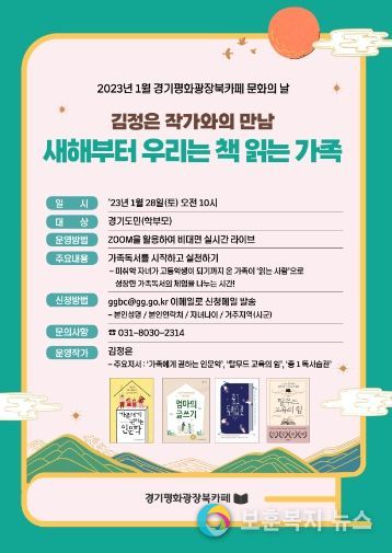 보훈복지뉴스 유서진 기자 | 경기도청 북부청사에 위치한 경기평화광장 북카페는 2023년 1월 문화의 날 프로그램으로 오는 28일 오전 10시 가족 독서 강연 프로그램 ‘새해부터 우리는 책 읽는 가족’을 운영한다.
