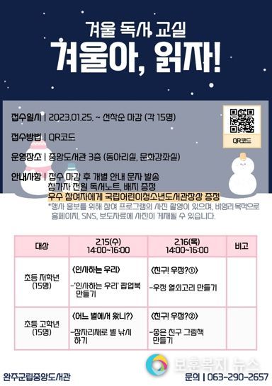 프로그램 신청은 완주군 도서관 홈페이지 공지사항에서 ‘2023년 중앙도서관 겨울독서교실 참여자 모집’ QR코드로 접수하면 된다.