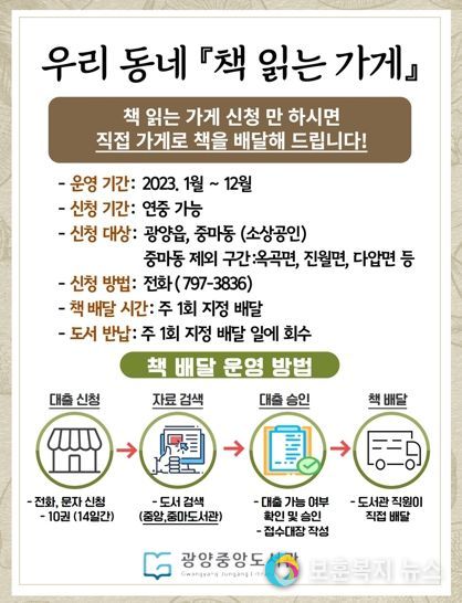 보훈복지뉴스 유서진 기자 | 광양시립도서관이 지역사회 독서문화 확산을 위해 도서관 방문이 어려운 지역 내 소상공인을 위한 책 배달 서비스'책 읽는 가게'를 운영한다.