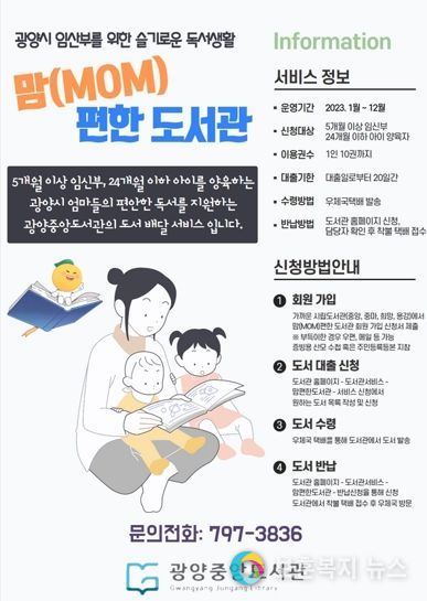 보훈복지뉴스 유서진 기자 | 광양중앙도서관은 지역 내 임산부와 영유아를 대상으로 집에서 편하게 책을 받아볼 수 있는 도서 배달 서비스'맘(MOM) 편한 도서관'을 운영하고 있다고 26일 밝혔다.