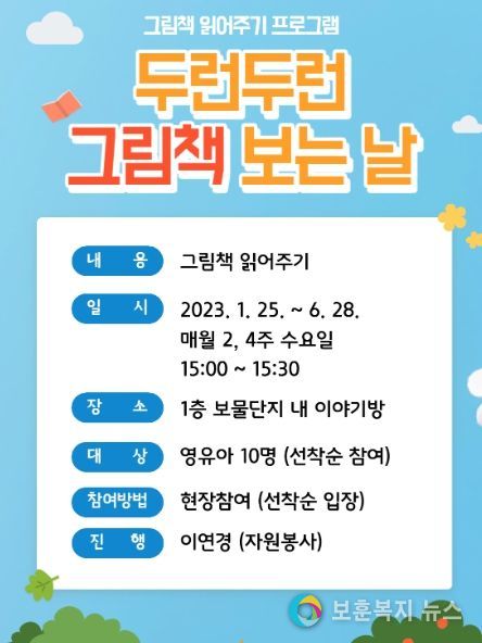 보훈복지뉴스 유서진 기자 | 고양특례시 주엽어린이도서관이 오는 1월 25일부터 재능 기부 프로그램 '두런두런 그림책 보는 날'을 운영한다.