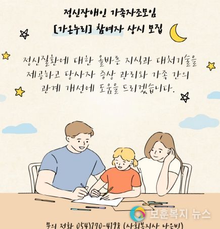 보훈복지뉴스 유서진 기자 | 포항시 북구보건소 정신건강복지센터는 2023년 정신장애인 가족 자조 모임 ‘가온누리’ 참여자를 상시 모집한다고 13일 밝혔다.